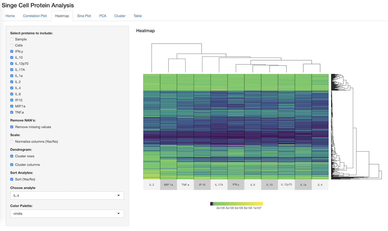 A Shiny app (R) was built for interpreting the results after performing quality control. The web application was able to display 1) correlation plots, 2) heatmaps, 3) sina plots, 4) principle component analysis (PCA), 5) k-means clustering and 6) display the data in a table. Other analysis tools are in the process of being added (t-SNE, SPADE, etc). This tool enables users to easily produce single-cell analysis statistics and clusting as well as interactively explore their data.