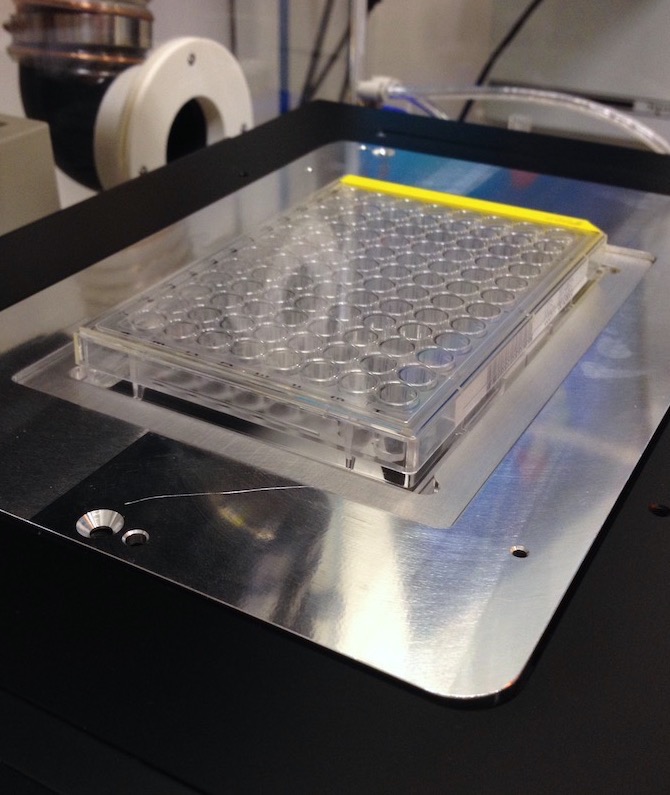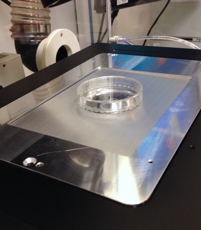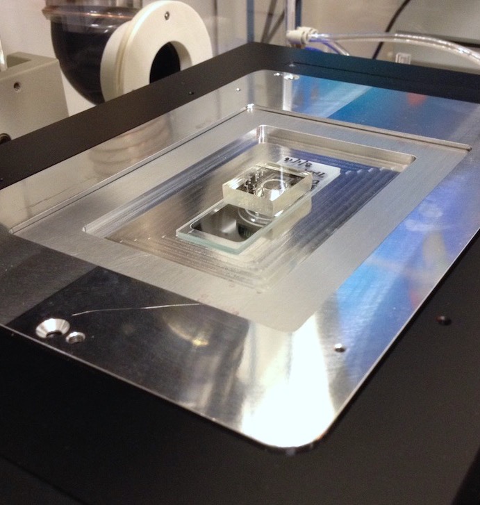 We machined a universial stage holder and inserts for our Nikon Eclipse Ti motorized stage. The parts were machined in aluminum (ideally anodized black afterwards). The universial stage holder attaches to the stage using acrylic M3 flathead screws. The various inserts (well plate, 1x3 microscope slide, petri dishes, etc) are placed into the holder and can be easily swapped. The universial stage holder is compatible with our CO2 chamber for localized CO2 delivery.